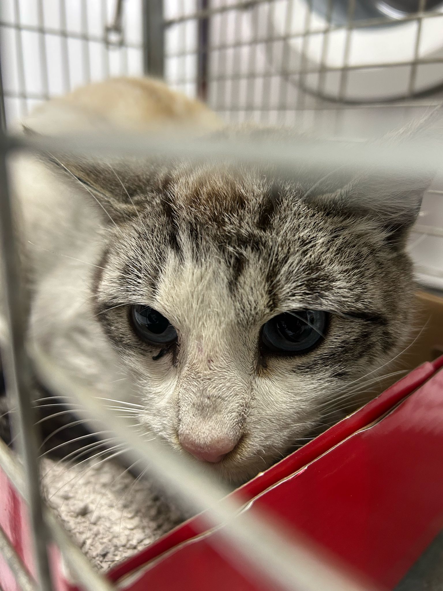 Descripción: GATO COMUN EUROPEO ATIGRADO Y BLANCO, POCO SOCIALIZADO.