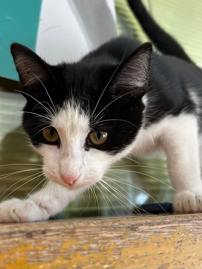 Descripción: GATO COMUN EUROPEO CON PELAJE NEGRO Y BLANCO..